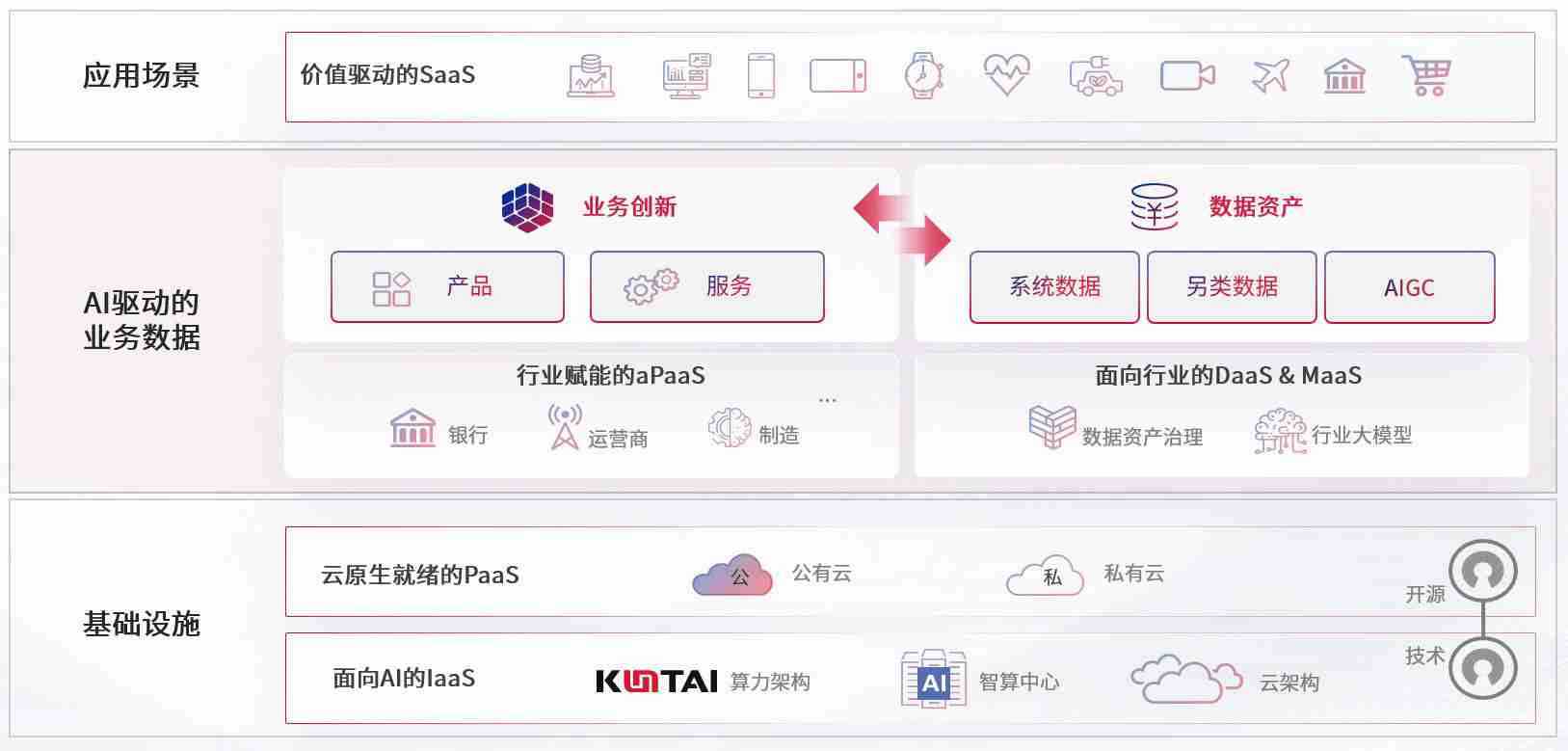 数字时代,,围绕企业数字化转型的关键要素,,PA旗舰厅数码开创性的提出数云融合战略和技术体系框架,,,,着力在云原生、、数字原生、、、AI原生和信创产业上架构产品和服务能力,,,,为处在不同数字化转型阶段的快消零售、、、汽车、、、、金融、、、医疗、、政企、、教育、、运营商等行业客户提供泛在的敏捷IT能力和融合的数据驱动能力,,构建跨界融合创新的数字业务场景和新业务模式,,助力企业级客户建立面向未来的核心能力和竞争优势,,全面推动社会的数字化、、智能化转型升级。。。